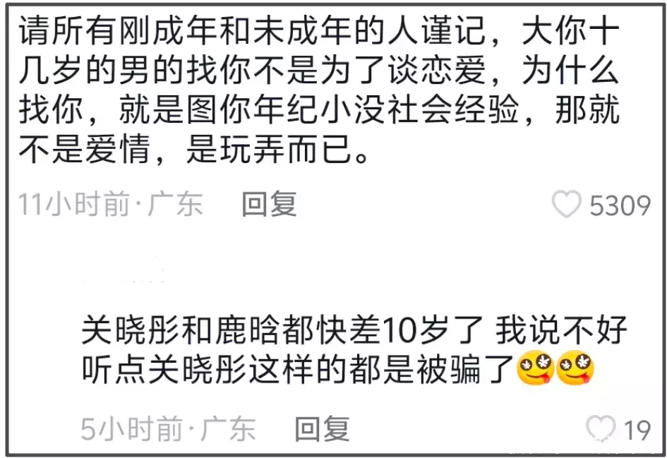 有人拿鹿晗和关晓彤举例,关晓彤和鹿晗在一起的时候,和刘一诺差不多大,如今鹿晗和檀健次都卷入了司晓迪风波,某种程度上,老男人找小姑娘恋爱,就是看中女生年纪小、没经验、好哄骗。
