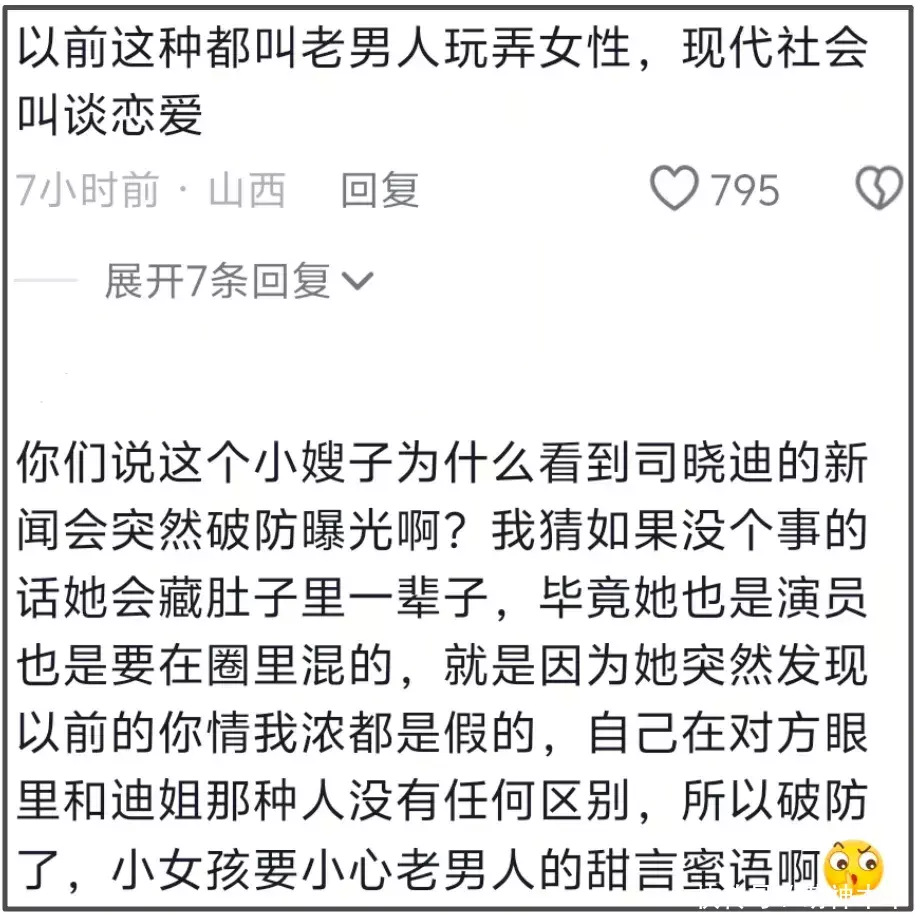 有人直言,刘一诺之所以会因为司晓迪破防,是意识到被哄骗了,以为是正常恋爱,结果对方只是玩弄。