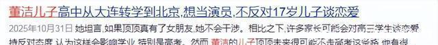 而升入高中前,顶顶一直就读于母亲家乡大连的某个学校,后来为了让他获得更好的教育资源,转学到了北京,就读于某个国际学校,据说一年的学费近30万元。 董洁也曾在访谈类节目中透露,儿子有考北影的想法。